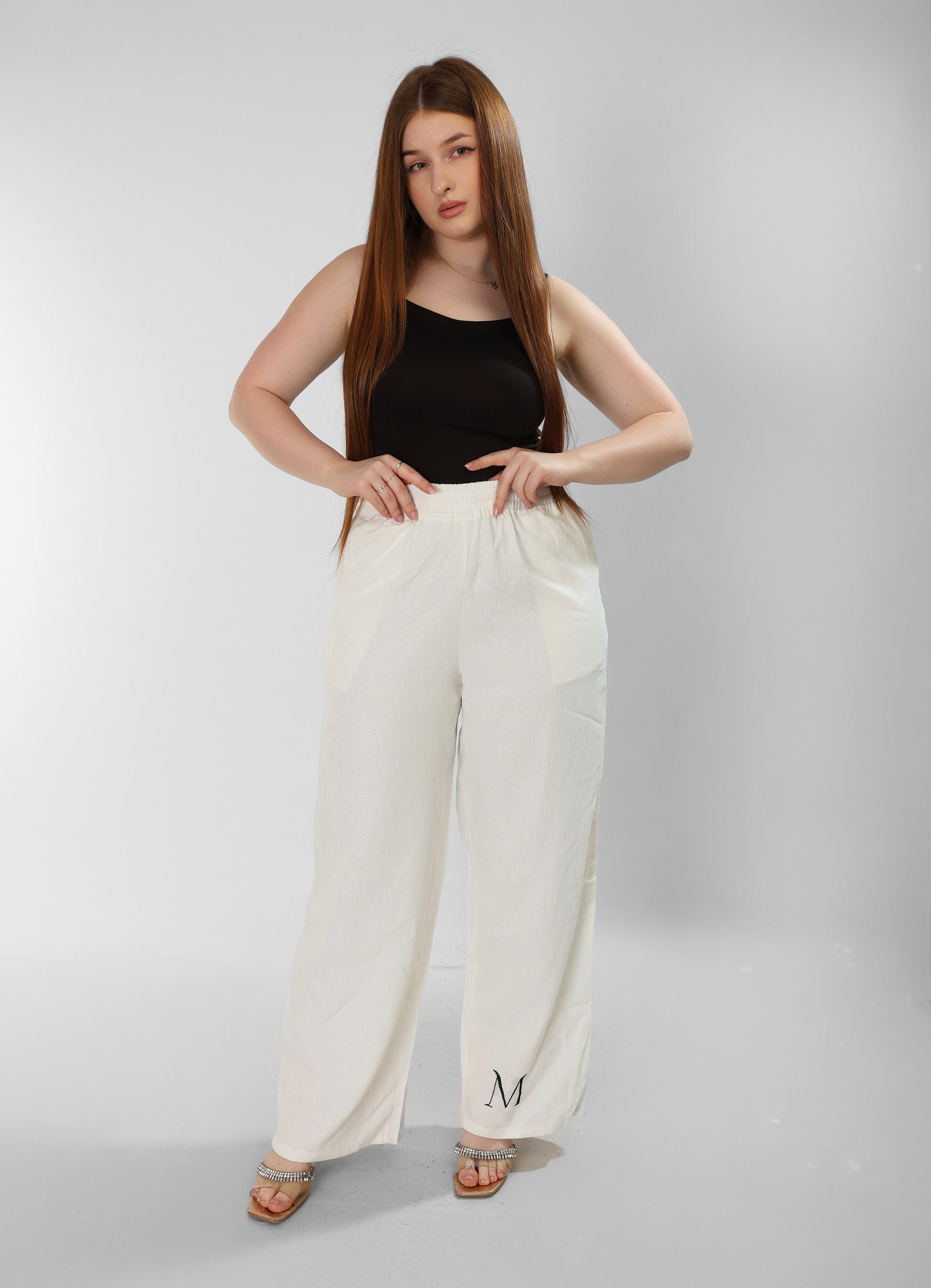 Pure Linen White Pants with Signature ‘M’ Embroidery