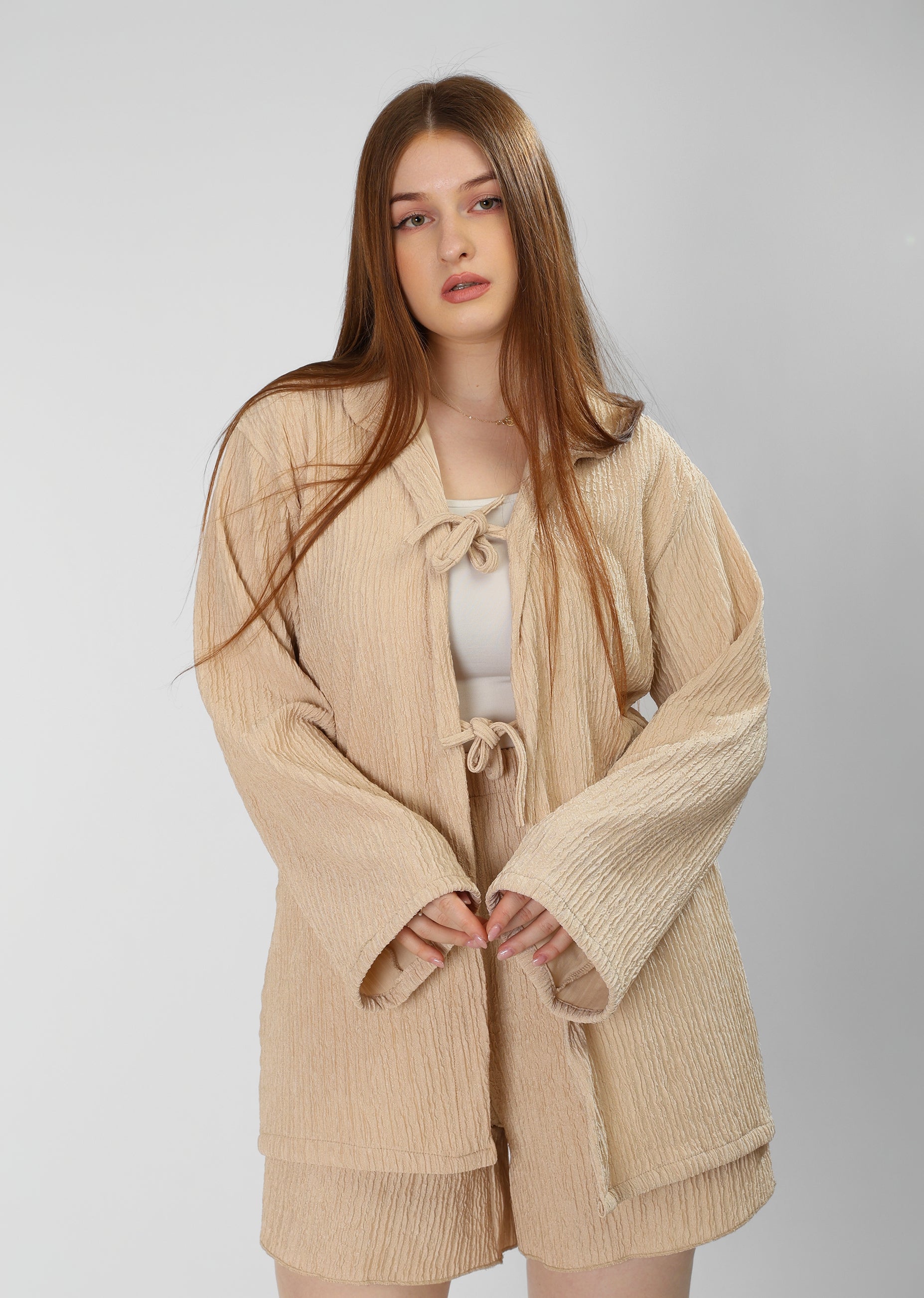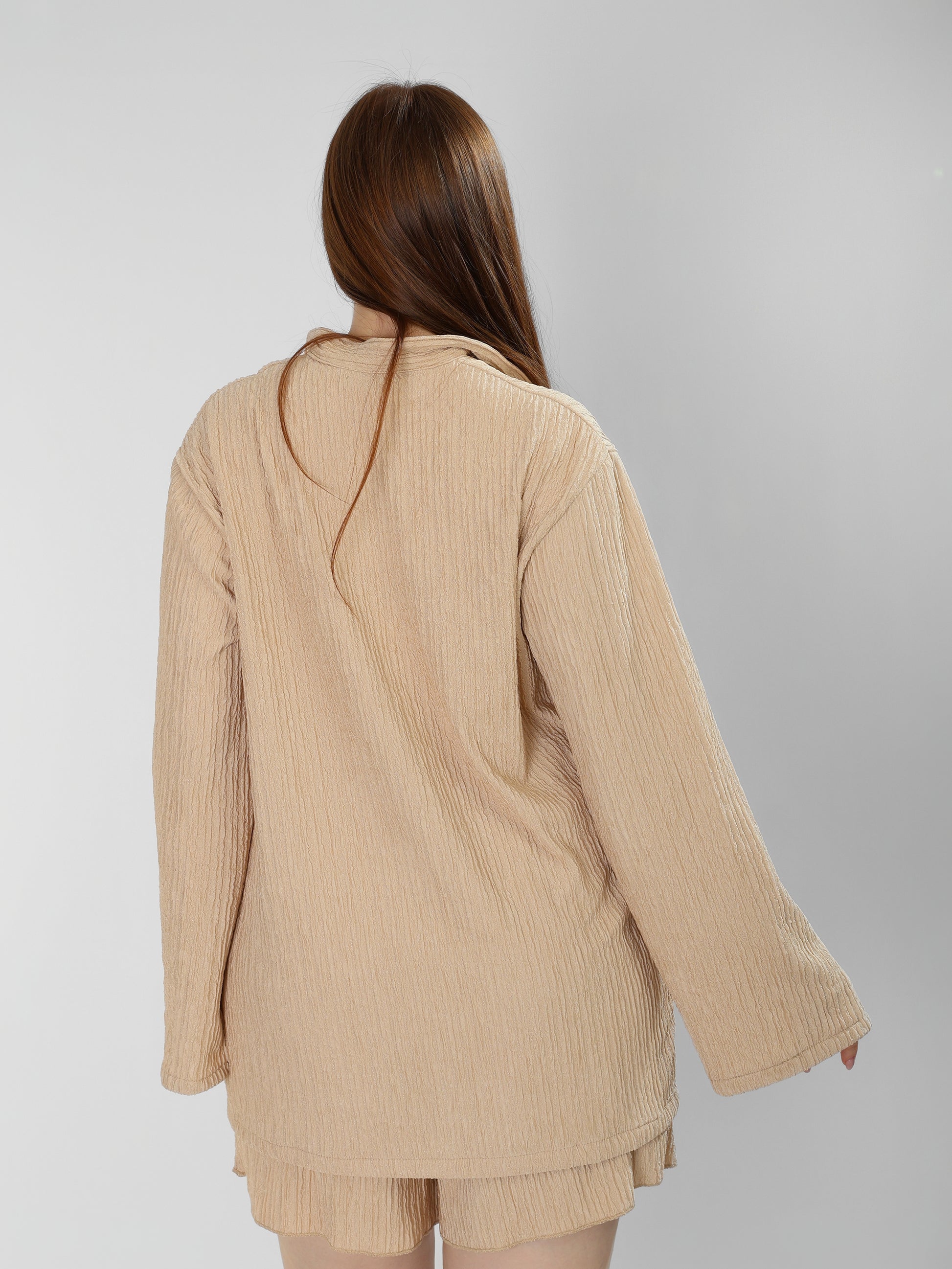 Experience refined comfort with this elegant two-piece set in a soft beige hue. Designed from premium breathable cotton, the set features a long-sleeve shirt with a structured collar and polished cuffs, perfectly paired with relaxed-fit shorts for an effortlessly chic look.