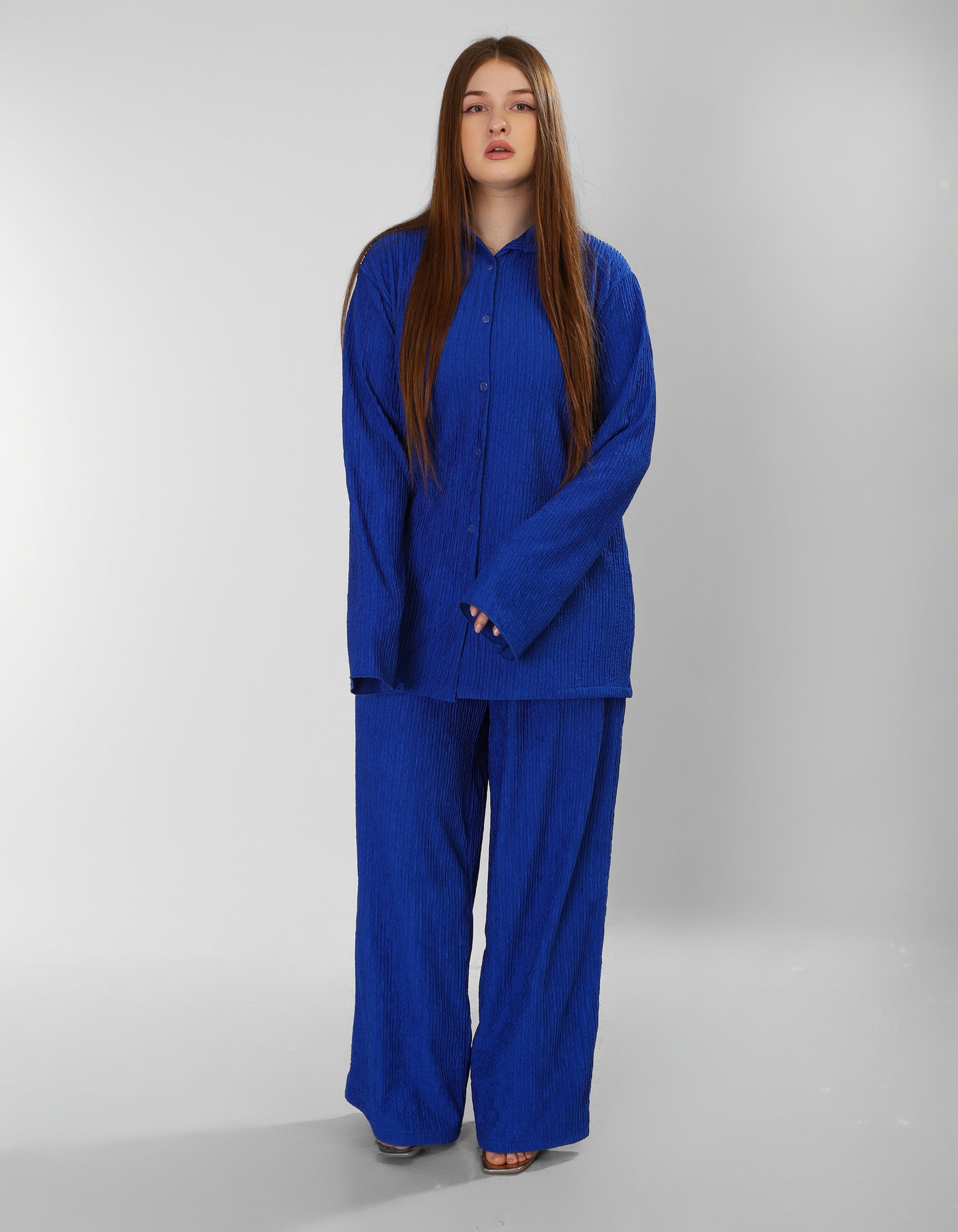 Step into serene elegance with this two-piece cotton set in a delicate blush blue hue — a refreshing blend of calm and charm. The long-sleeve shirt features a structured collar and refined cuffs, while the wide-leg trousers offer relaxed movement and all-day comfort.