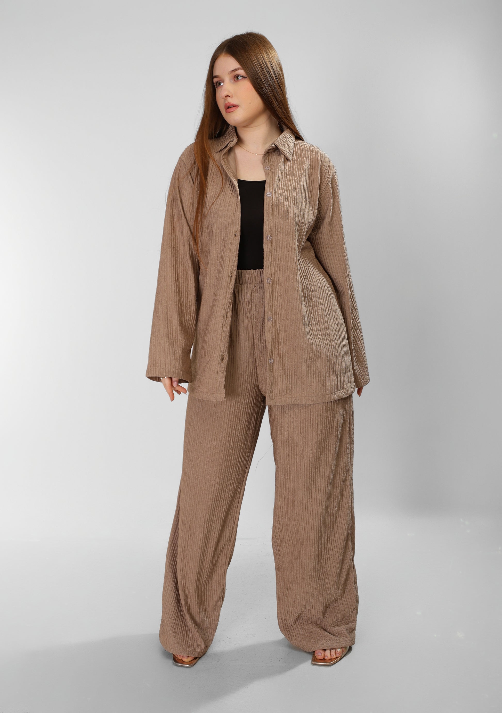 Elevate your everyday look with this luxurious cotton set in a rich coffee brown hue that speaks of grounded elegance and timeless charm. The set features a long-sleeve shirt with a refined collar and stylish cuffs, paired with wide-leg trousers that offer complete comfort and effortless movement throughout the day.