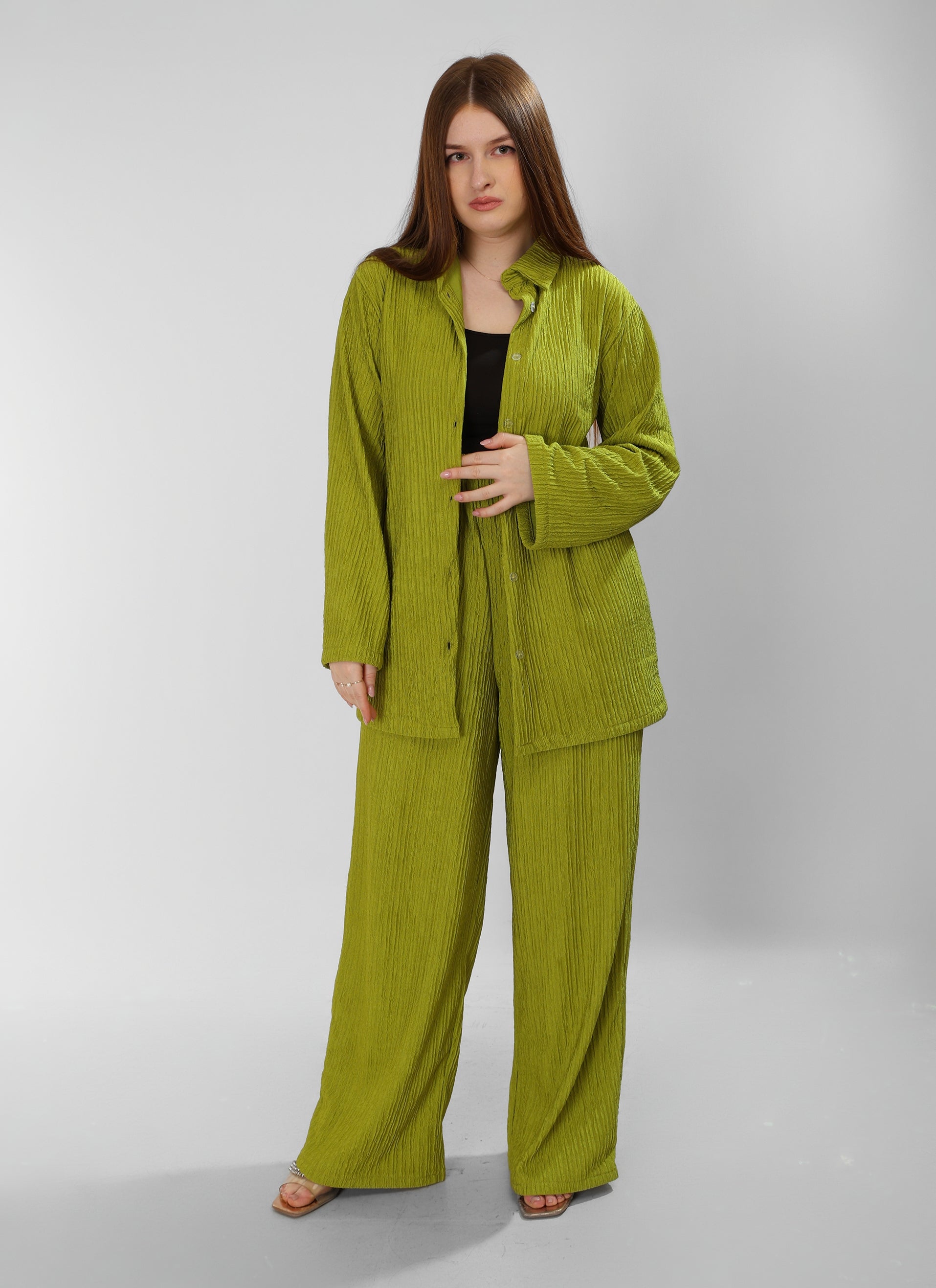 Elevate your everyday look with this luxurious cotton set in a vibrant kiwi hue that exudes fresh elegance. The set features a long-sleeve shirt with a refined collar and stylish cuffs, paired with wide-leg trousers that offer complete comfort and effortless movement throughout the day.